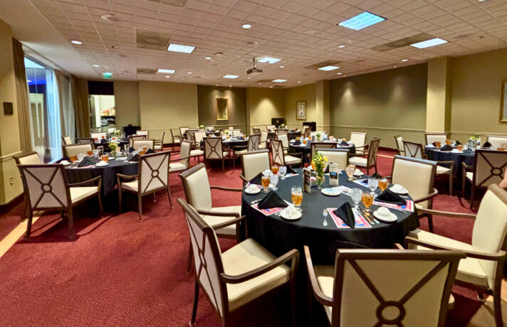 Located on the second floor, Dunn–French Library offers an intimate and refined setting ideal for business luncheons, board meetings, seminars, and small receptions. The space accommodates up to 40 guests seated, 32 classroom-style, 60 theater-style, 18 in a U-shape, or 60 guests for a reception, providing flexibility for both professional and social gatherings.