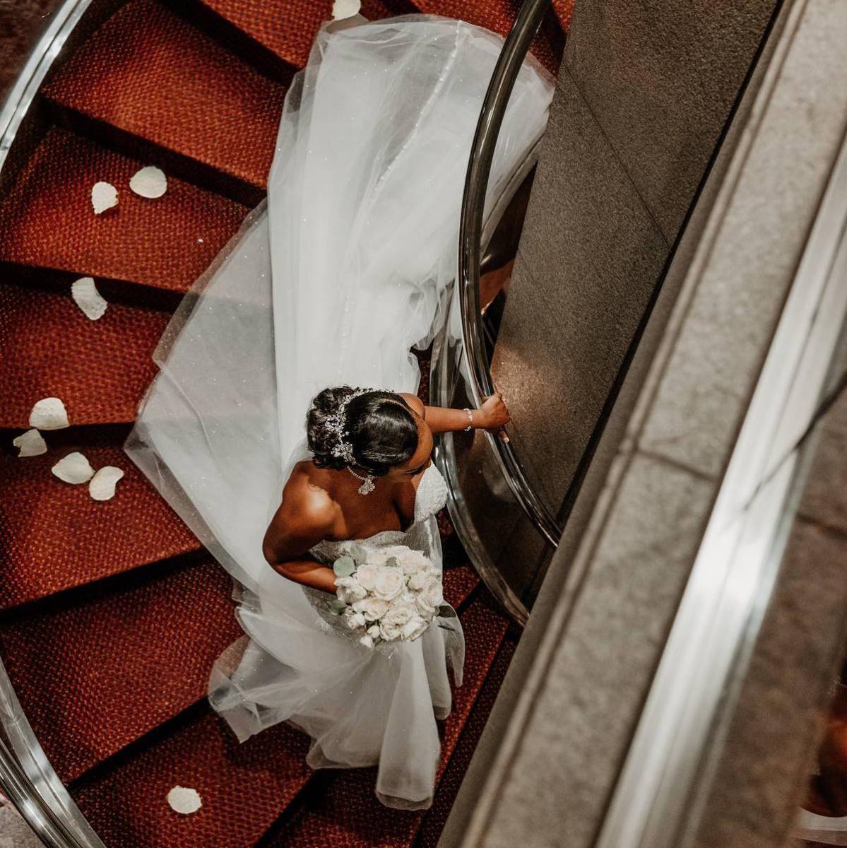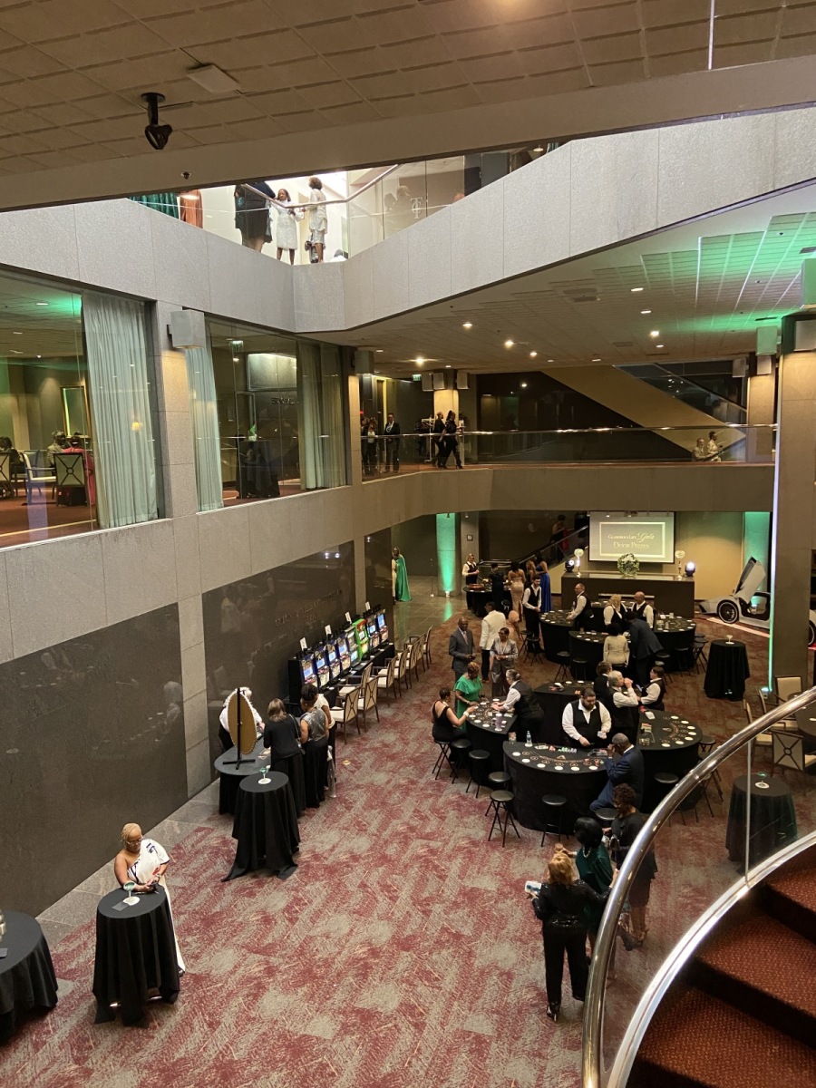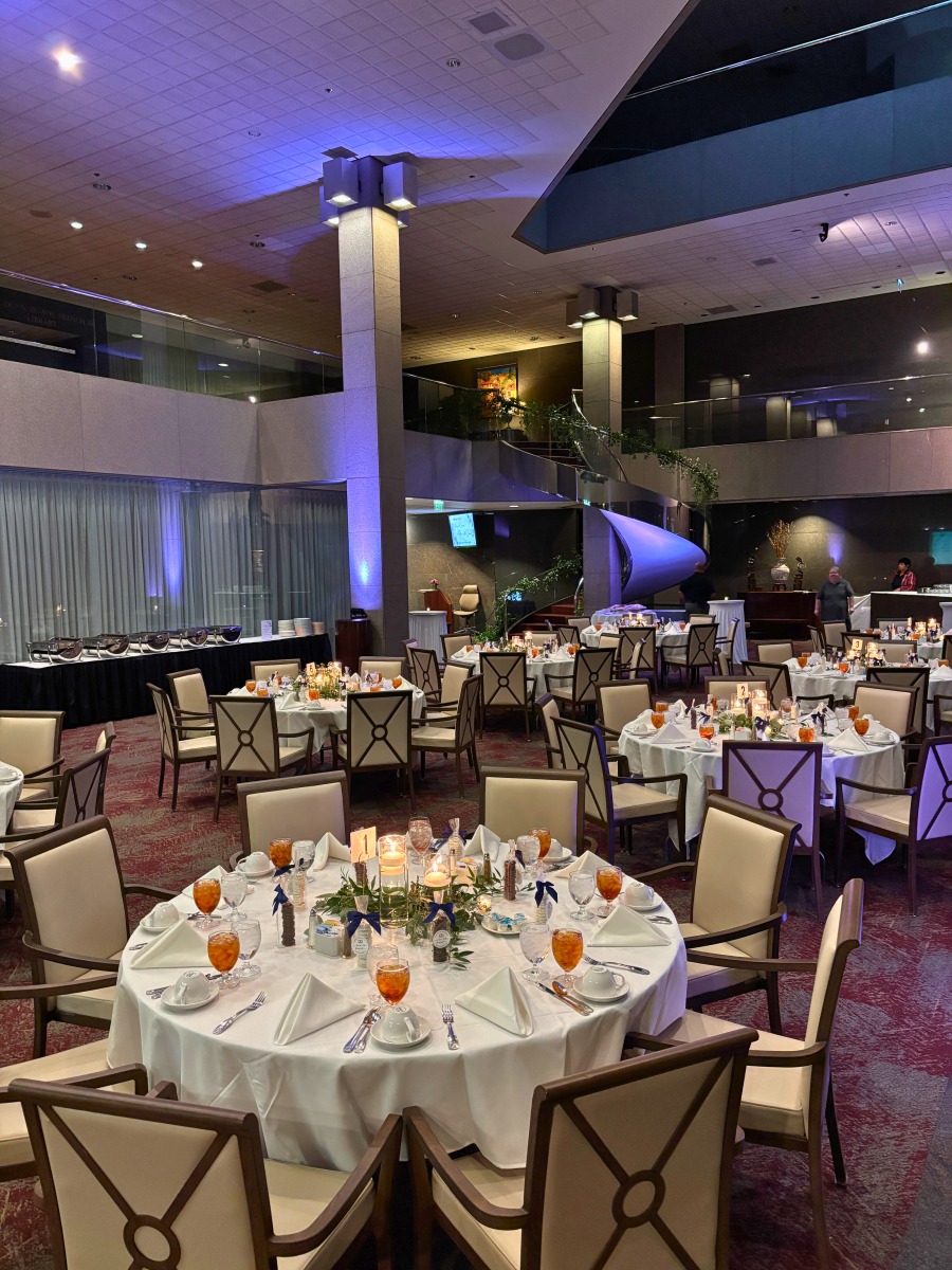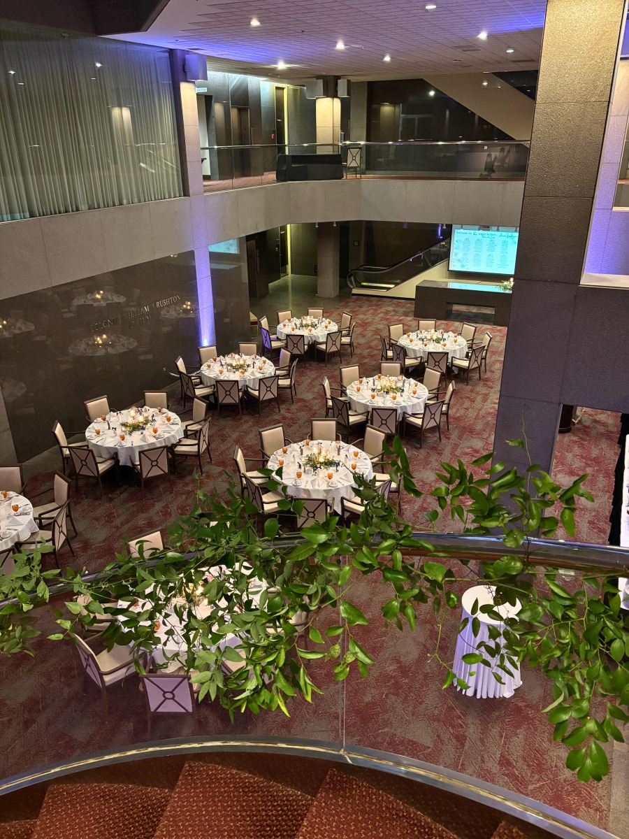 A signature feature of the Atrium is its chrome and glass spiral staircase, a dramatic architectural focal point frequently used for photo opportunities and grand entrances. Additional amenities include complimentary Wi-Fi, a ceiling-mounted screen, and a 3,300-lumen LCD projector, allowing the space to transition seamlessly from presentation to celebration.